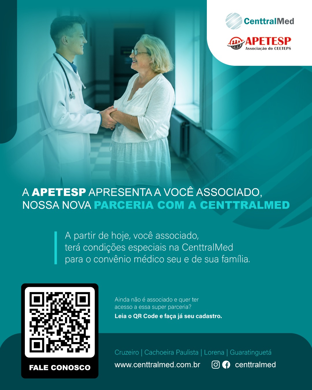Nova proposta de Parceria com a CenttralMed: Convênio para Plano Familiar e Individual. Clínica que realiza consultas médicas e odontológicas, exames laboratoriais e de imagens em caráter particular. Sem carência e limite de idade. Atende cidades de Cruzeiro, Lorena, Guaratinguetá e Cachoeira Paulista. Consulte as vantagens folder apetesp3 GUIA-MEDICO-CENTTRALMED-28-10-2021