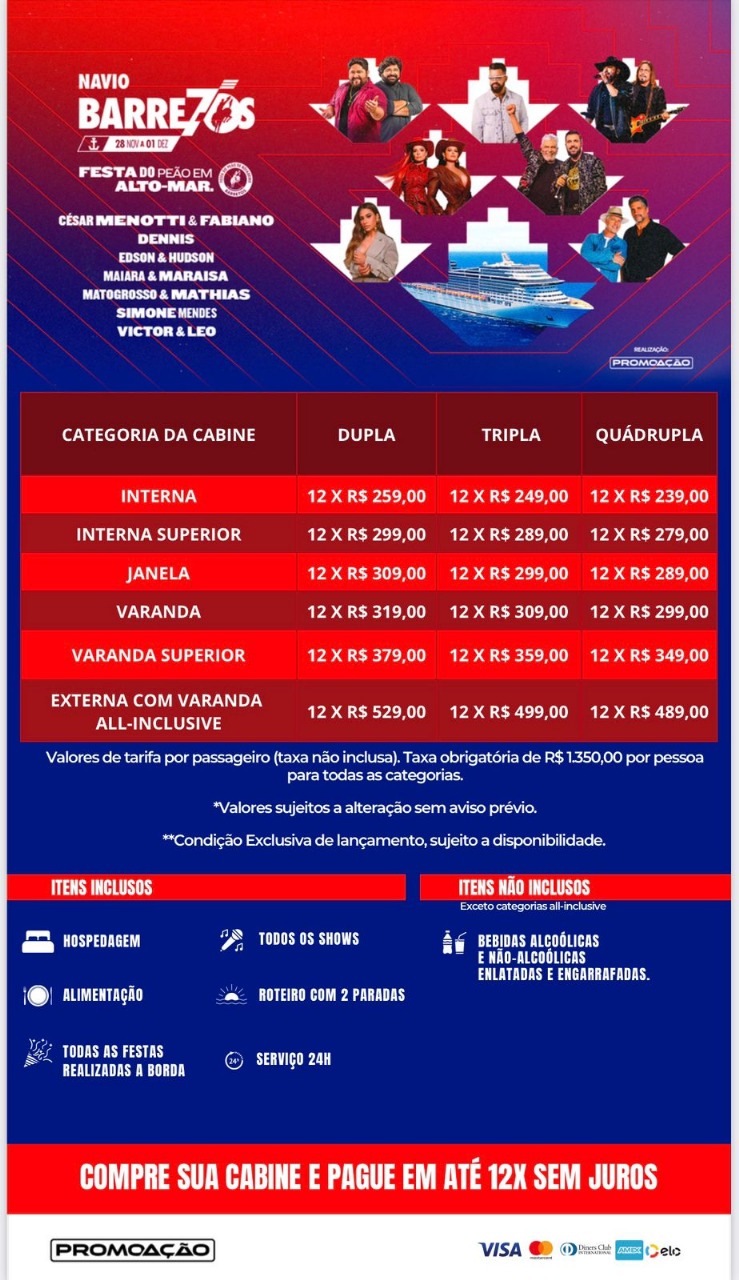 Serão 72h de uma festa incrível, com a presença de César Menotti & Fabiano, Dennis, Edson & Hudson, Maiara & Maraisa, Matogrosso & Mathias, Simone Mendes e Victor & Leo, e que contará com o conforto de um dos mais famosos e luxuosos transatlânticos do mundo.